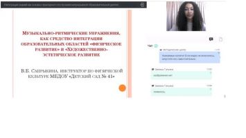 Инструктор по физической культуре Сапрыкина В.Б. провела практическую работу, в рамках которой участники вебинара освоили приемы использования на занятиях музыкально-ритмических упражнений как одно из средств интеграции образовательных областей «Физическое воспитание» и «Художественно-эстетическое развитие».