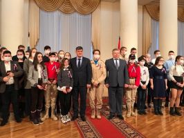 11 декабря в рамках Всероссийской акции «Мы граждане России» в Доме Дворянского собрания прошло торжественное вручение паспортов лучшим представителям молодёжи Тульской области. Среди них присутствовали новомосковские юнармейцы МБОУ «СОШ № 5» Качановская Светлана и Валов Матвей. Им вручали паспорта председатель Тульской городской Думы Н. Воробьев и министр молодежной политики Тульской области А. Давлетшин.