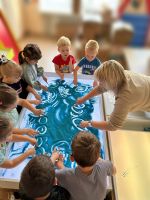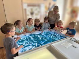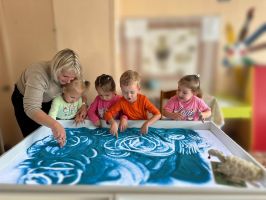 В МБДОУ «Детский сад №16» функционирует кружок дополнительного образования для детей возрастной категории от 3 до 5 лет «Песочные сказки». На занятии под руководством воспитателя Тебякиной Юлии Александровны детки с большим удовольствием рисуют на песочном столе «кудрявых овечек».