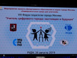 26 августа 2019 г. в Российском университете дружбы народов (РУДН) состоялся VIII Форум педагогов г. Москвы «Учитель цифрового города: настоящее и будущее». В рамках Форума на методологическом семинаре «Учитель говорящий и учитель пишущей в свете преподавания русского языка и литературы» с докладом по теме «Готовим школьников к успешному написанию контрольных работ, ВПР, ОГЭ и ЕГЭ по русскому языку» выступила Долгих О.В., методист МКУ «ИМЦ».