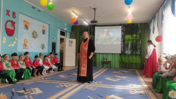 Утренник с детьми подготовительной группы посетил клирик храма в честь иконы Божьей Матери «Нечаянная Радость» протоиерей Михаила Новиков.