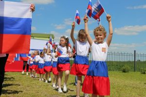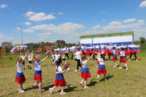 Затем ребята вместе со своими наставниками представили спортивно-танцевальную композицию. Яркое зрелище сопровождалось оформлением в цвета триколора и символами государственности.