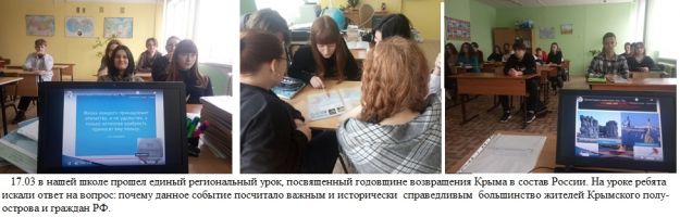 В соответствии планом мероприятий празднования в Тульской области Дня воссоединения Крыма с Россией 17 марта 2021 года во всех муниципальных общеобразовательных организациях прошел единый региональный урок, посвященный годовщине возвращения Крыма в состав России. В мероприятии приняли участие 4468 учащихся. Информация о проведении размещена на официальных сайтах образовательных организаций.