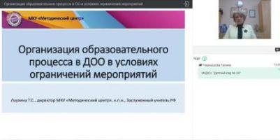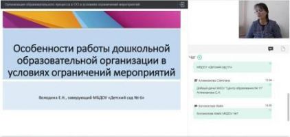 Об особенностях работы дошкольной образовательной организации в условиях ограничений мероприятий участникам рассказала Володина Елена Николаевна, заведующий МБДОУ «Детский сад № 6». Опытом работы по теме «Детский сад-онлайн: как организовать дистанционное обучение дошкольников» поделилась с коллегами Бочарова Елена Николаевна, заведующий МБДОУ «Детский сад № 34 «Радуга».