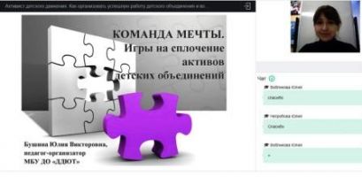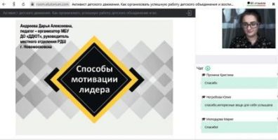 8 декабря 2020 года прошел вебинар «Активист детского движения. Как организовать успешную работу детского объединения и воспитать лидера?». Вебинар провели Андреева Д.А., руководитель местного отделения РДШ г. Новомосковска, педагог-организатор МБУ ДО «ДДЮТ», Бушина Ю.В., педагог-организатор МБУ ДО «ДДЮТ», и Дворянкина В.А., педагог-организатор МБОУ «СОШ № 8».